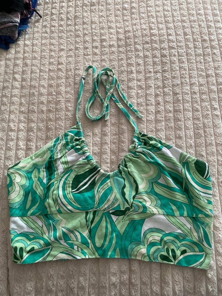 Bağlamalı, yeşil tie-dye desenli, dantel detaylı bohem tarzda, günlük kullanıma uygun fitted crop top.