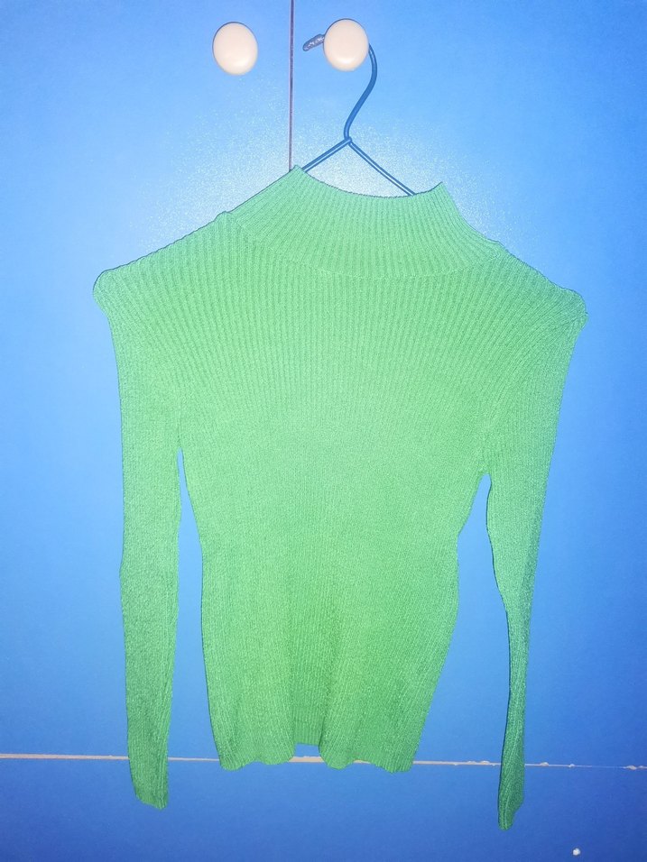 Fitted kesim, balıkçı yaka ve uzun kollu yeşil triko kazak. Minimalist ve trend sokak stili için uygun, normal midi uzunluğunda, günlük kullanıma uygun.