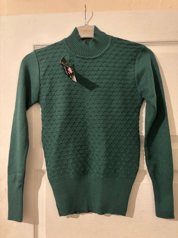Yeşil renkte, balıkçı yaka ve uzun kollu, vücuda oturan örme triko kazak. Dokulu yapısıyla rahat ve şık bir günlük kullanıma uygun.