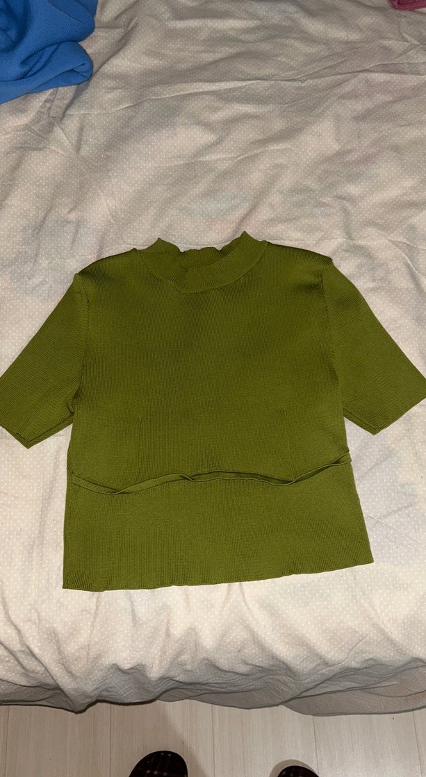 Yeşil renkte, balıkçı yaka ve kısa kollu, vücuda oturan örgü hamile bluzu. Normal boyda ve parlak görünümlü, günlük kullanıma uygun.