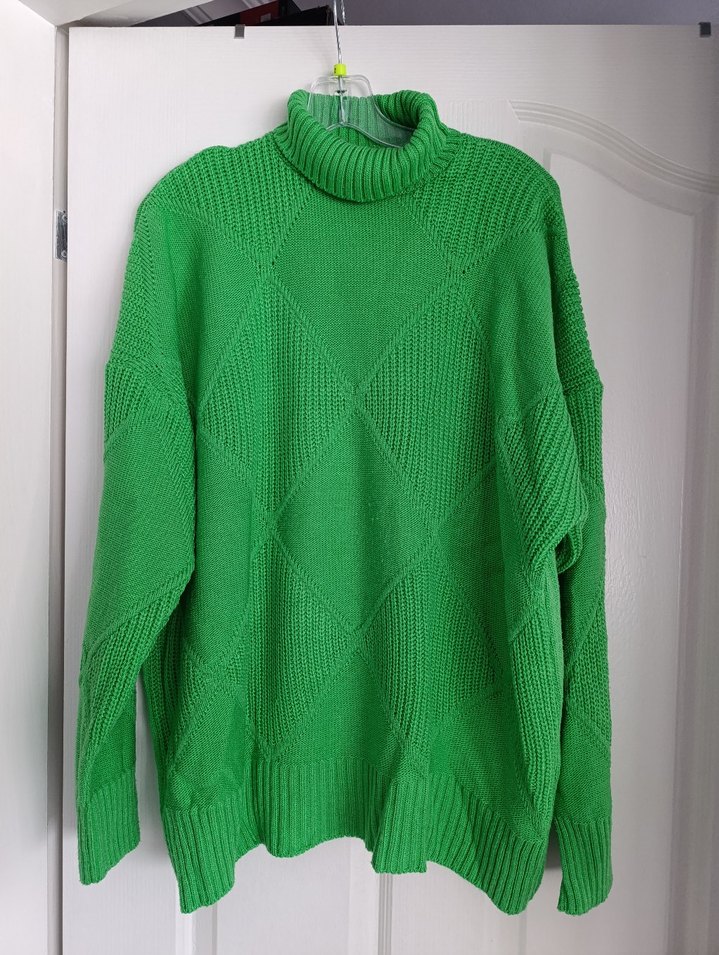 Canlı yeşil renkli, balıkçı yaka ve uzun kollu örgü kadın kazak, rahat kesimi ve midi boyuyla konforlu bir şıklık sunar.
