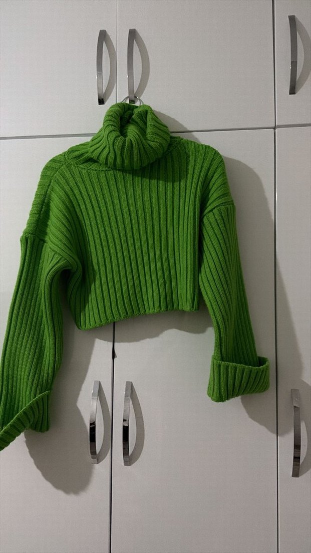 Yeşil renkli, balıkçı yaka ve uzun kollu, örgü dokulu, vücuda oturan kadın kazak. Normal boyda ve sade desensiz, günlük kullanıma uygundur.