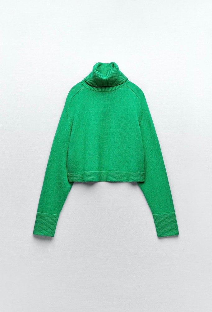 Yeşil renkte balıkçı yaka, uzun kollu ve triko dokumalı crop kadın kazak
