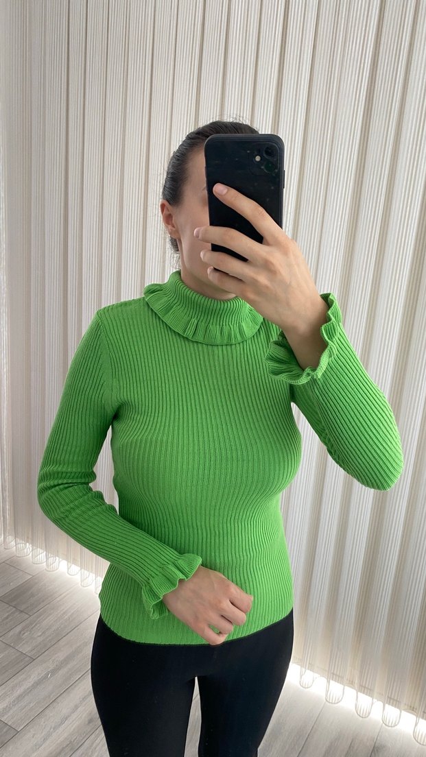 Yeşil renk, balıkçı yaka ve uzun kollu, ince triko dokusuyla rahat ve normcore tarzda günlük kullanıma uygun kazak.