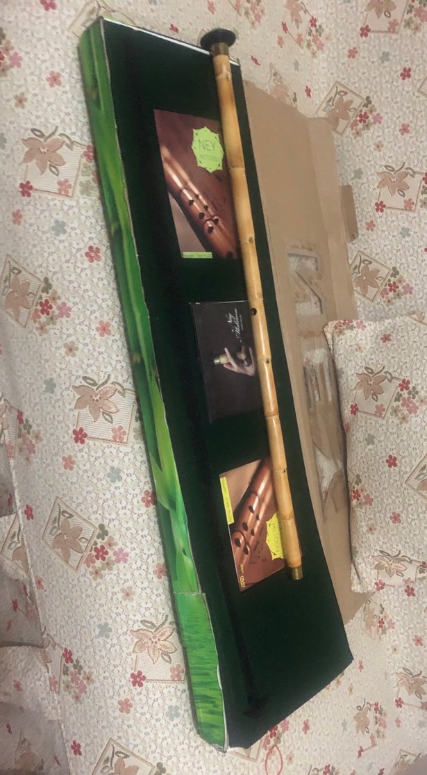 Koyu yeşil renkte bambu flüt ve yeşil kılıf, yanında kullanım kitapçıkları ile birlikte.