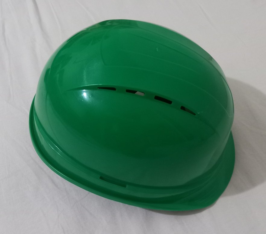 Yeşil renkli, dayanıklı plastikten yapılmış baret. Minimalist tasarımı ve havalandırma delikleri ile sade ve şık bir görünüm sunar. ️ Yan tarafta birkaç küçük boya izi var. Fotoda görülebiliyor. Boyu 26 cm.