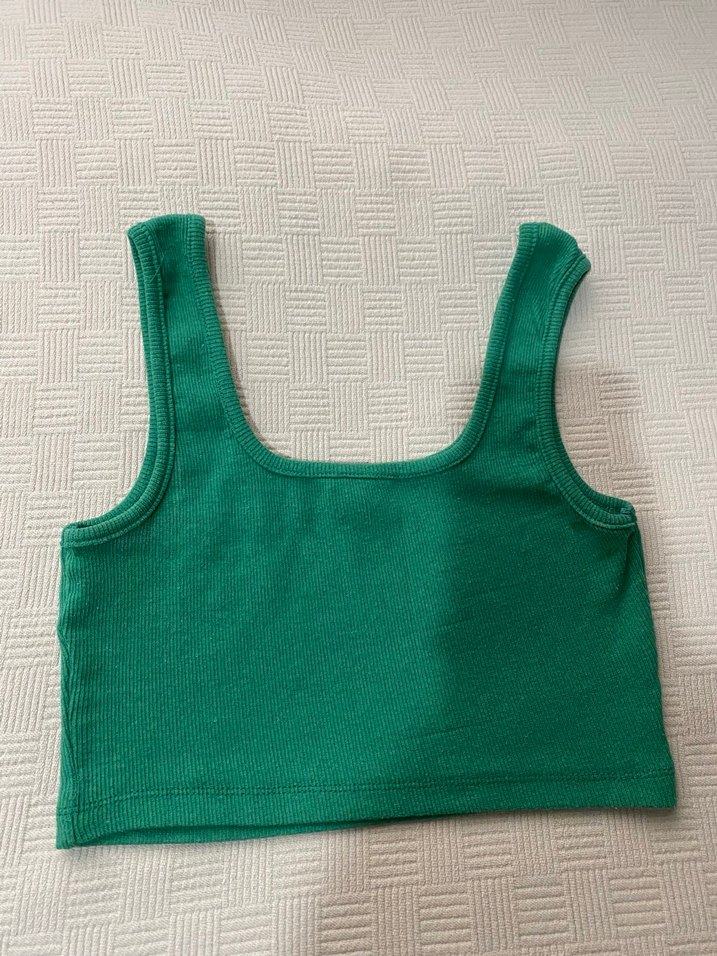 Yeşil renkli, askısız yaka ve kolsuz tasarıma sahip, vücuda oturan crop top. Düz ve hafif parlak sentetik kumaştan üretilmiştir. STANDART BEDENDİR.