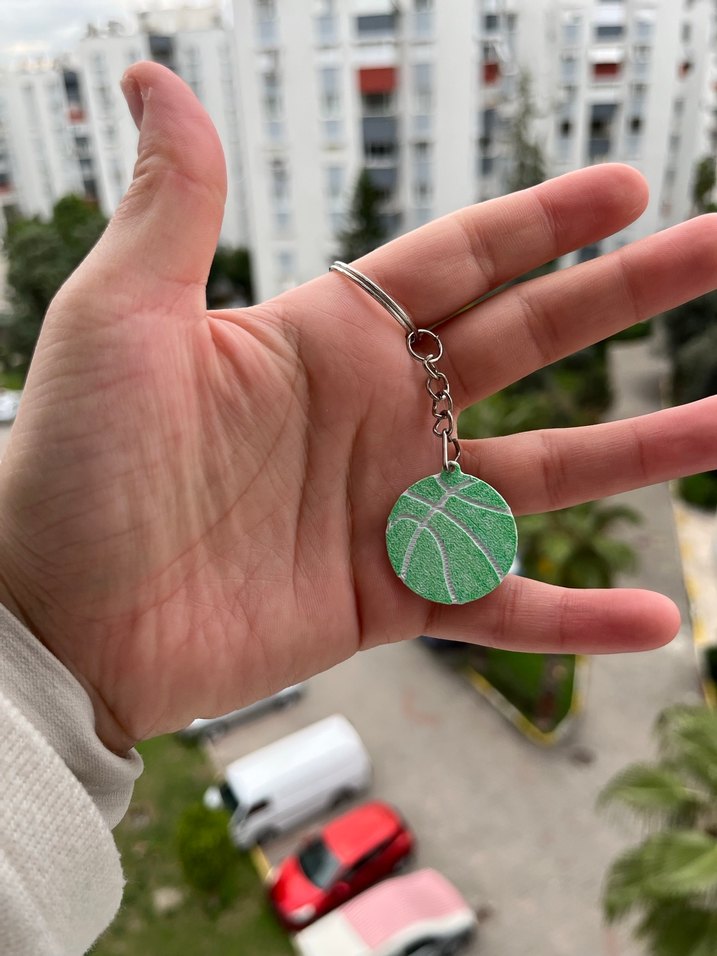 Parlak yeşil basketbol figürlü anahtarlık. Ürün 3D printer ile basılmış olup malzemesi plastiktir. Basım hatası kaynaklı bir yüzeyde pürüzler mevcuttur (son iki fotoğrafta görebilirsiniz). Akrilik boya ile boyanmıştır.