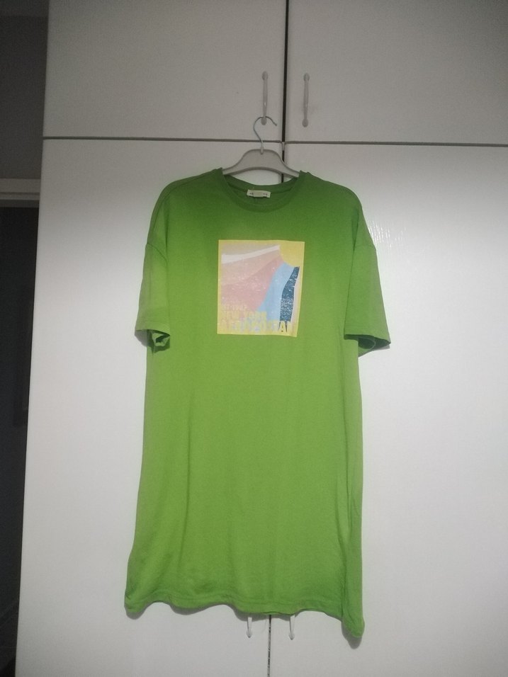 Yeşil renkli, kısa kollu, yuvarlak yaka bayan tişörtü. Pamuklu kumaştan, pastel baskılı ve bol kesim, günlük rahat stil için uygun. Boyu uzun