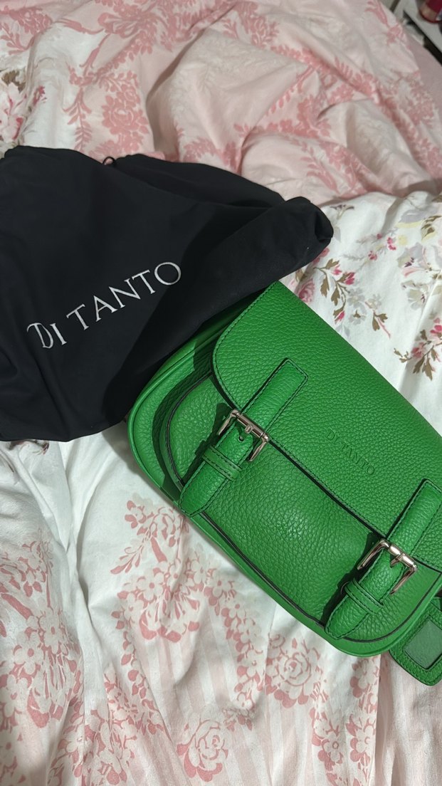 Koyu yeşil renkte, baskılı dokulu DI TANTO marka bebek çantasıdır. Önünde tokalı detayları ve koruyucu kılıfı vardır.