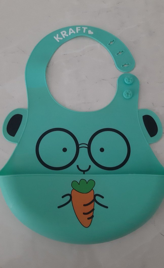Renkli, baskılı ve ayarlanabilir düğmeli bebek önlüğü, kolay temizlenebilir malzemeden üretilmiştir.