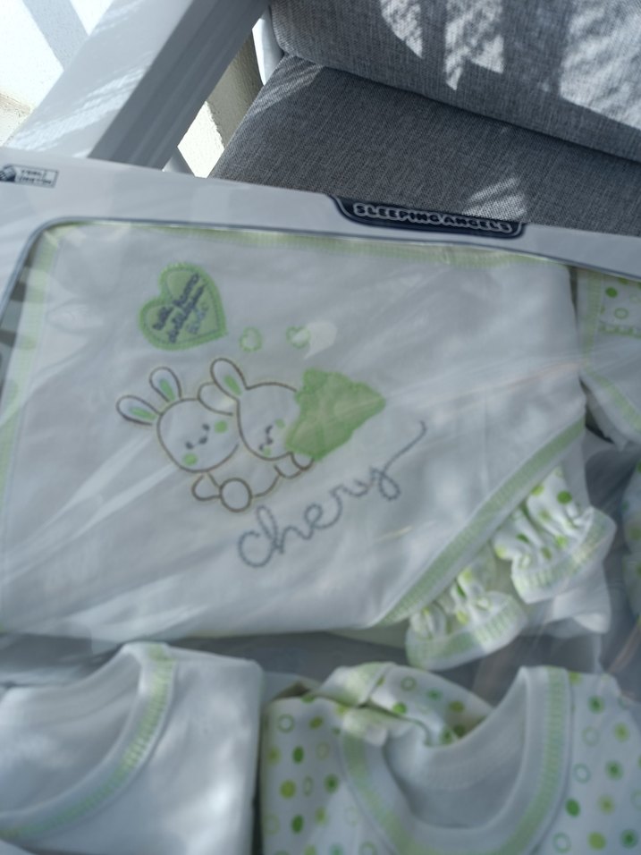 Pastel yeşil renkli, baskılı sevimli tavşan desenli ve yumuşak dokulu bebek hastane çıkışı 11 parça