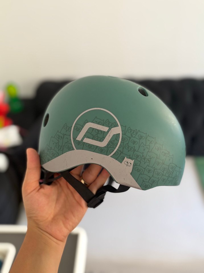 Yeşil baskılı biker kaskı, gri detaylara sahip ve güvenli tutuş için Velcro bant içerir. Scoot and Ride markasına aittir ve ışıklıdır