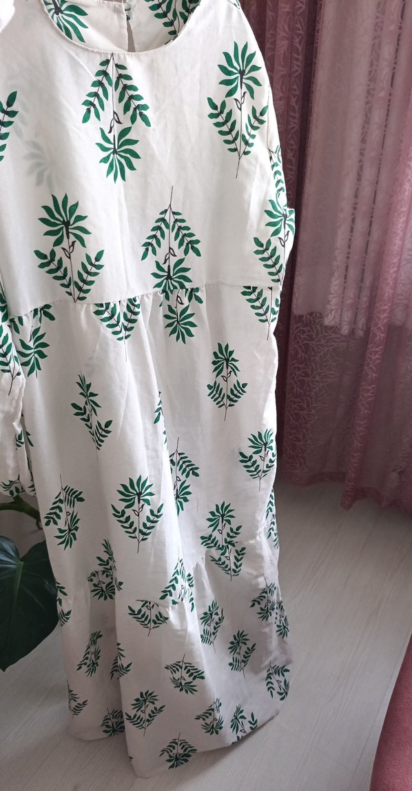 Yumuşak pamuk kumaştan, yeşil baskılı, V yaka ve kolsuz bohem tarzda uzun, bol kesim elbise. Drapeli tasarımıyla rahat bir görünüm sunar.