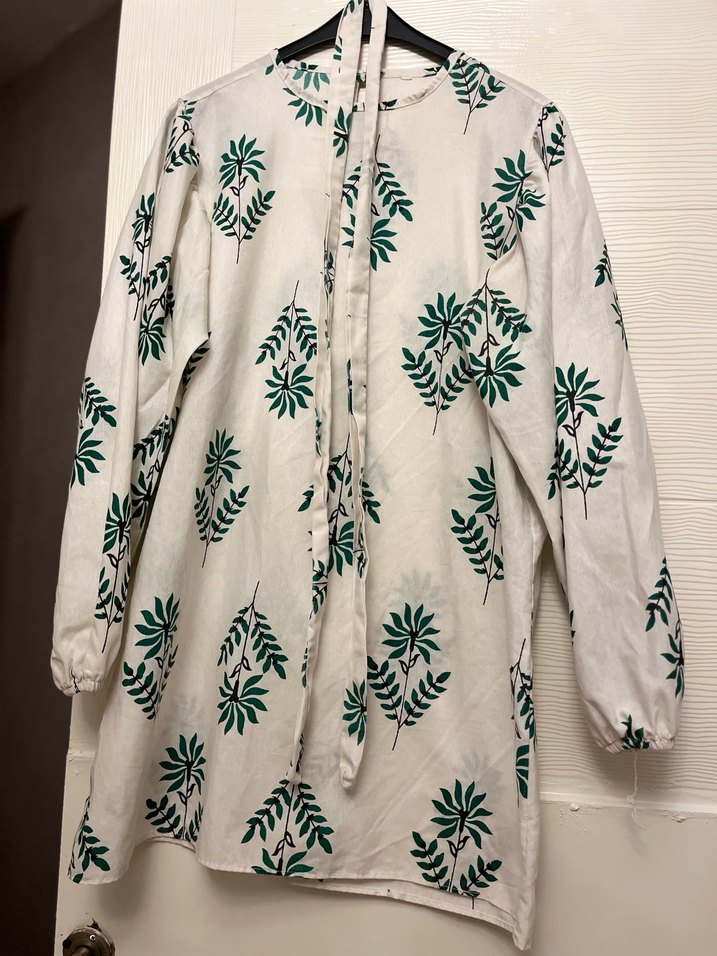 Yumuşak pamuktan yapılmış, bağlamalı yüksek yakalı, uzun kollu, düğmeli ve bol kesim yeşil yaprak desenli bohem