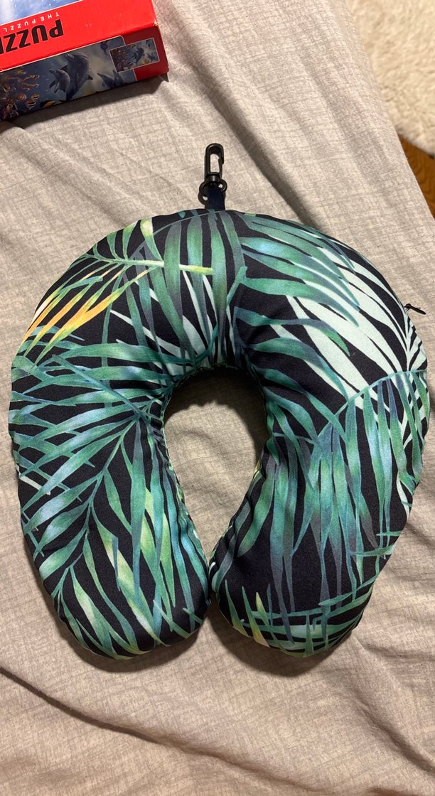 Koyu yeşil baskılı, klipsli boyun yastığı, rahat ve taşınabilir.
