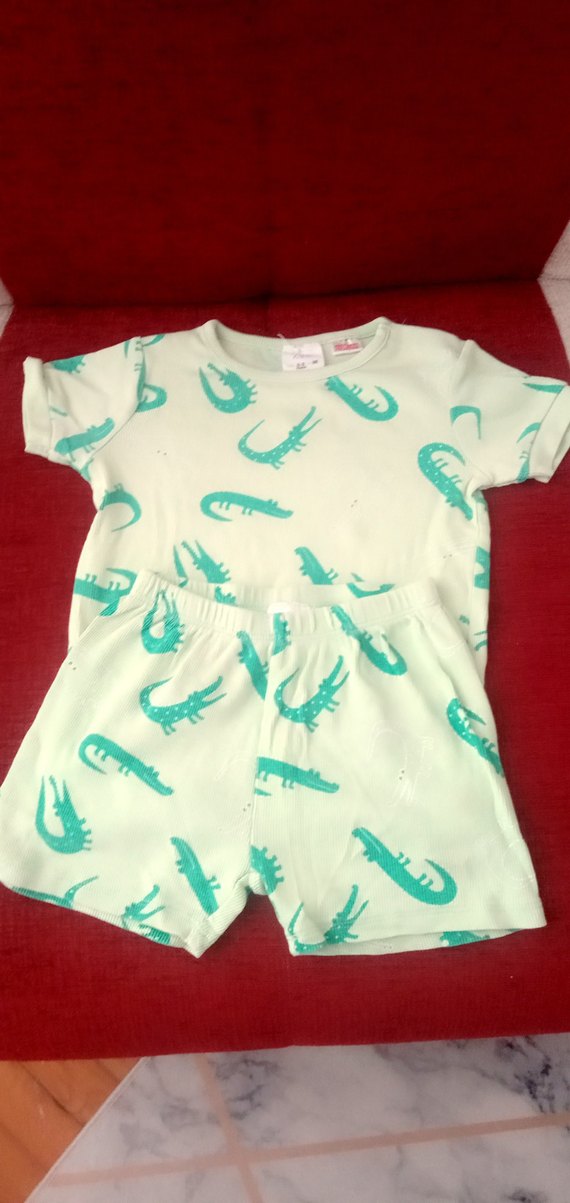 Yumuşak yeşil kumaş üzerine renkli timsah baskılı çocuk alt üst takımı, rahat kullanım sağlar. Sıfır ayarında bir üründür.