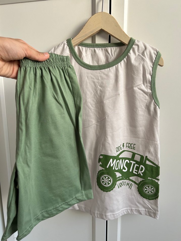 Yumuşak kumaştan, yeşil baskılı çocuk atlet ve şort takımı. Beyaz atlet, yeşil kenarlıklı ve baskılı detaylıdır.