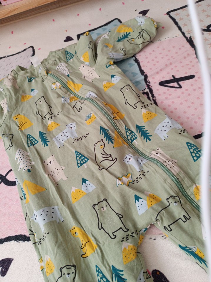 Pastel yeşil renkte, ayı ve ağaç desenli baskılı çocuk uyku tulumu. Sentetik kumaştan üretilmiş olup, ön kısmında fermuar bulunmaktadır. Sayılı giyildi herhangi bir sıkıntısı yok 24 36 ay