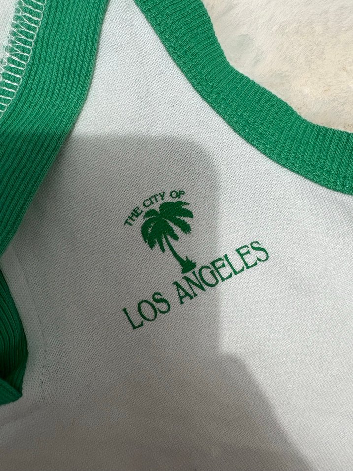 Hafif yeşil renkli, 'LOS ANGELES' ve palmiye ağacı baskılı çocuk atleti. Yumuşak kumaş, ribanalı yakası ve kolları bulunur.