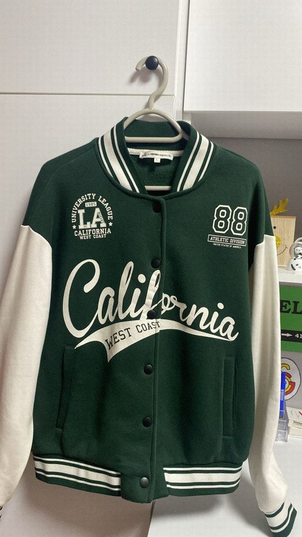 Yeşil renkli, uzun kollu, düğmeli ve bol kesim kadın ceket. Yumuşak ve sıcak fleece kumaştan, baskılı California West Coast deseniyle günlük kullanıma uygun.