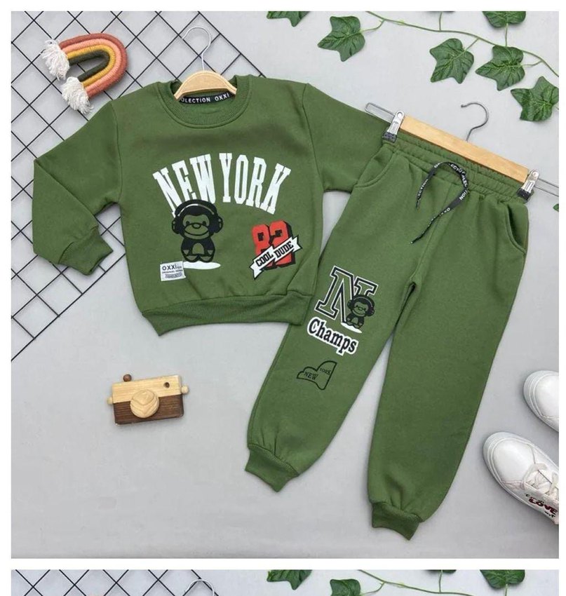 Koyu yeşil renkli, baskılı erkek çocuk eşofman takımı. Rahat kesim, crew neck ve yumuşak kumaş ile şık bir görünüm sunar. ️