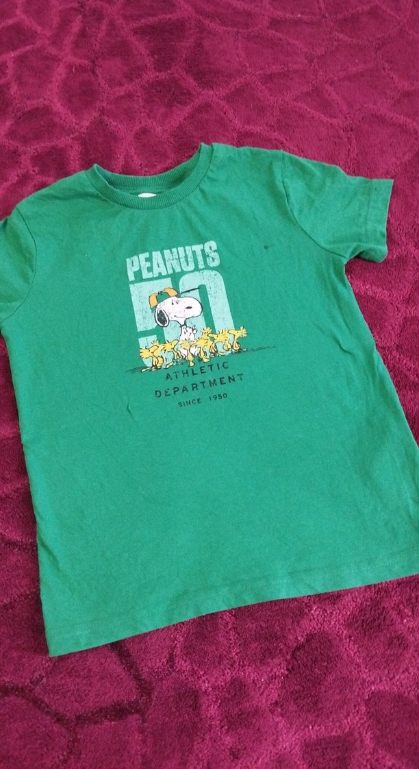 Pamuklu, yeşil, kısa kollu, bisiklet yaka erkek çocuk tişörtü. Üzerinde Snoopy ve Woodstock baskısı ile yazılar bulunur.