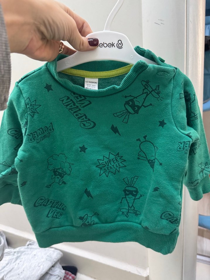 Yeşil renkli, baskılı desenlere sahip erkek çocuk sweatshirtü, bisiklet yaka ve uzun kolludur. Yumuşak örme kumaştan, bol kesimdir ve rahat bir kullanım sunar. bebek içindir leke defo yok