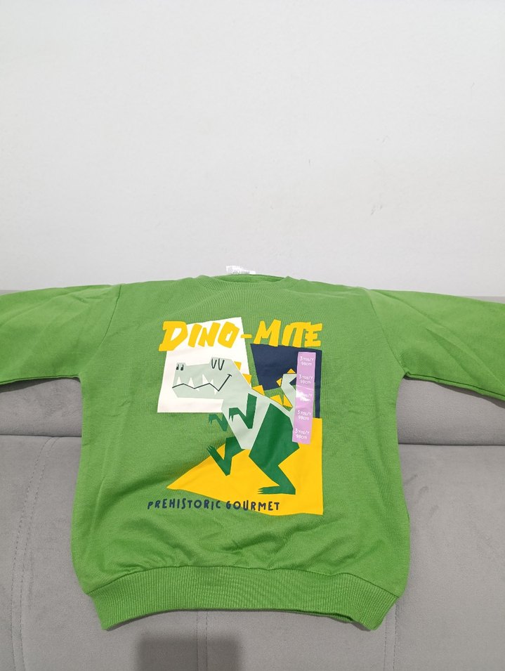 Yeşil renkte, uzun kollu ve bisiklet yaka erkek çocuk sweatshirtü. Renkli dinozor baskısı ve 'DINO-MITE, PREHISTORIC GOURMET' yazıları bulunur. Rahat kesim ve yumuşak sentetik kumaştan.