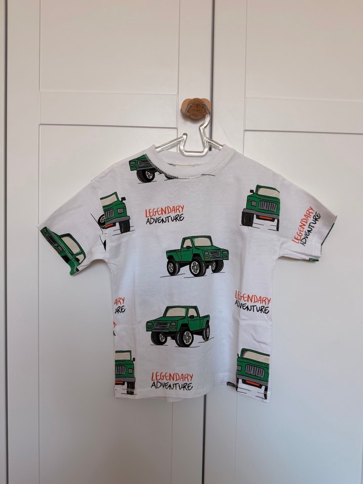 Hafif yeşil renkli, baskılı araç desenli, kısa kollu, bol kesim erkek çocuk tişörtü. Yumuşak örme kumaştan üretilmiştir.