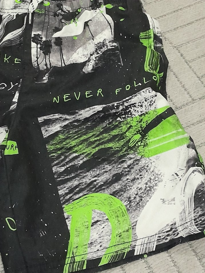 Gece yeşili baskılı, bol kesim erkek mini şort. Sokak stili ve rock punk esintileri taşıyan rahat bir dış mekan şortu. çocuk deniz şortu marka temsili etiketi kesilmiş 9 yaş grubu