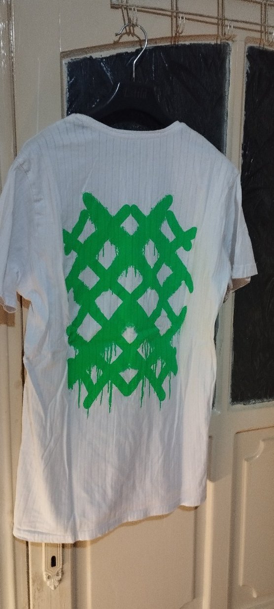Önü kısa kollu, yuvarlak yaka ve arka kısmında açık yeşil baskı deseni olan bol kesim erkek tişörtü. Günlük kullanım için yumuşak kumaştan.