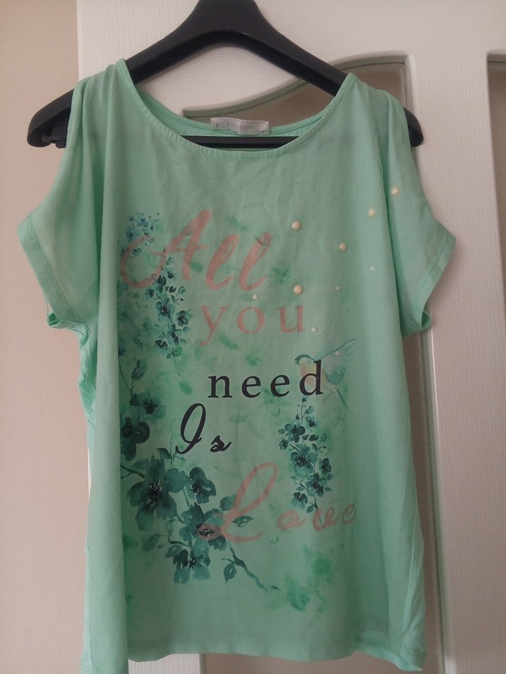 Pamuk kumaştan, yeşil pastel renkli, kısa kollu, drapeli ve bol kesim hamile tişörtü. Baskılı çiçek deseni ve midi boyda, günlük kullanıma uygun.butik ürünü
