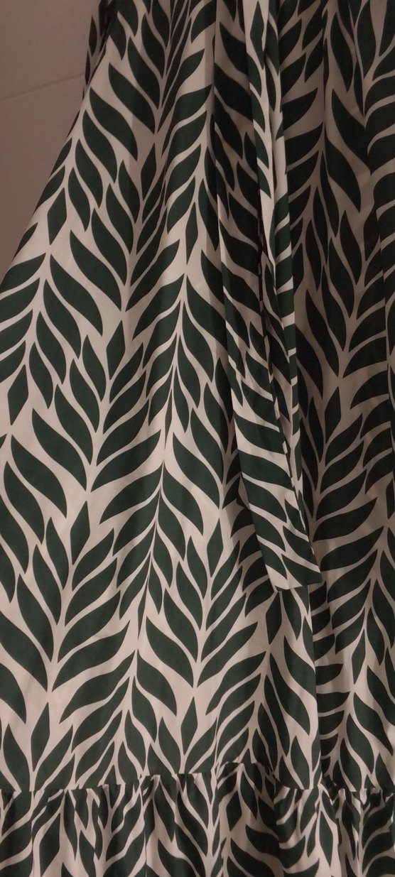 Yumuşak sentetik kumaştan, drapeli ve koyu yeşil baskılı uzun, bol kesim hamile eteği, günlük kullanım için uygundur.