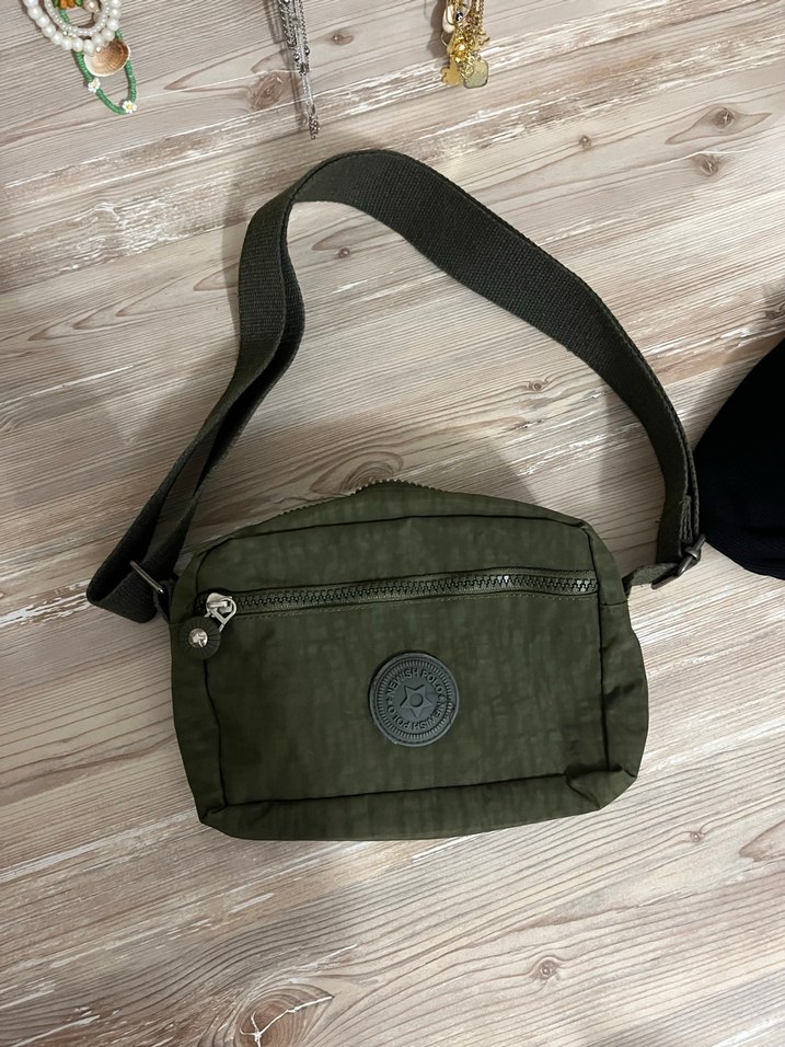 Yeşil baskılı sentetik kumaştan, kemerli tasarımlı kadın çapraz çanta. Günlük kullanıma uygun, pratik fermuarlı ön cep bulunur.