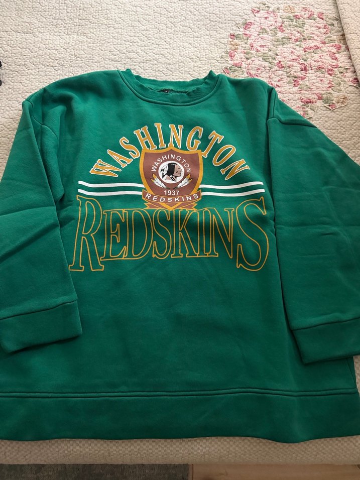 Yeşil, yuvarlak yaka, uzun kollu, baskılı Washington Redskins desenli örme kadın sweatshirt. Bol kesim ve normal boyda, günlük kullanıma uygun.