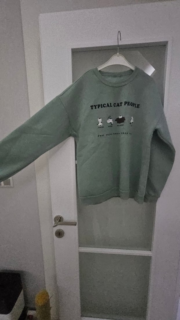 Yeşil renkli, uzun kollu ve bisiklet yaka kadın sweatshirtü. Yumuşak ve sıcak kumaştan, bol kesim ve baskılı desene sahip, rahat ve şık bir günlük parça.