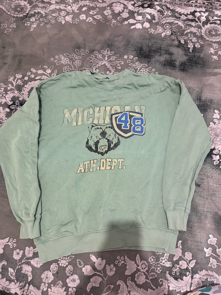 Yeşil renkli, uzun kollu ve bisiklet yaka kadın sweatshirtü. Yumuşak, örme kumaştan üretilmiş ve baskılı "MICHIGAN 48 ATH.DEPT." yazısı ile ayı figürü bulunur. Rahat ve spor kullanıma uygundur.