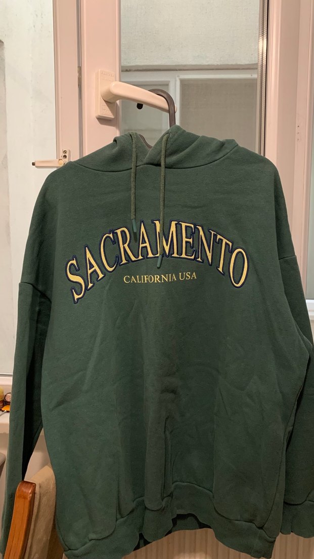 Yeşil renkli, uzun kollu, bisiklet yaka ve bol kesim kadın sweatshirtü. Yumuşak tüylü kumaştan üretilmiş ve önünde 'CALIFORNIA USA' baskısı bulunur. Günlük rahat kullanım için uygundur. Xs-S olmasına bakmayın M-L-XL bedene kadar uyumludur