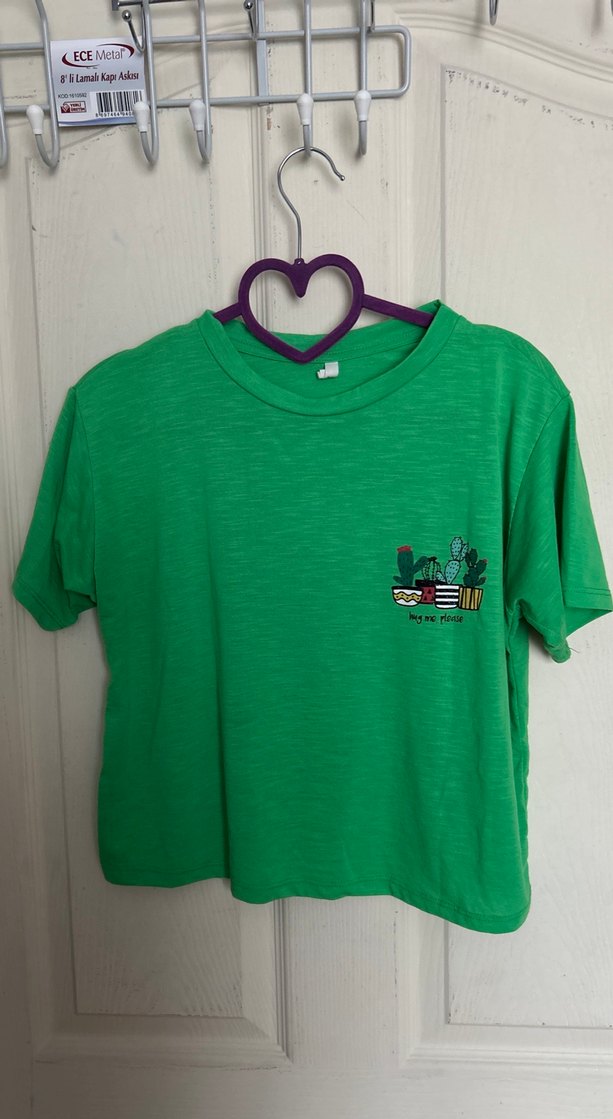 Pamuklu, yeşil renkli, kısa kollu, bol kesim kadın crop tişörtü. Renkli kaktüs baskısı ile rahat ve şık bir görünüm sunar.
