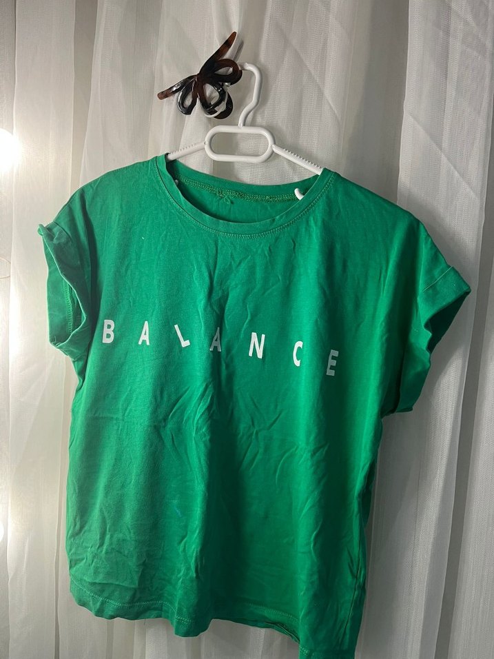 Yeşil renkli, pamuklu kumaştan kısa kollu, bol kesim kadın tişörtü. Ön kısmında "BALANCE" baskısı bulunur, günlük kullanıma uygundur.
