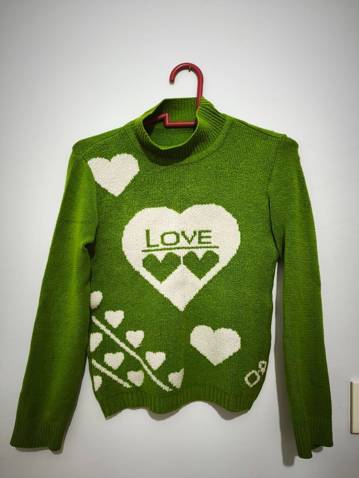 Yeşil renkli, 'LOVE' yazılı kalp baskılı triko kazak. Uzun kollu, bisiklet yaka ve bol kesimdir. Rahat ve günlük kullanıma uygundur.