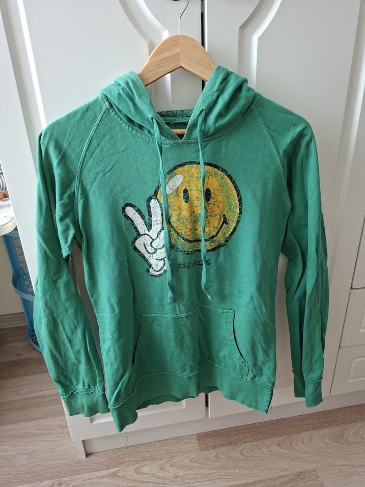 Yeşil renkli, kapüşonlu ve uzun kollu sweatshirt, rahat kesimi ve gülen yüz baskısı ile dikkat çeker. Yumuşak kumaştan üretilmiştir.