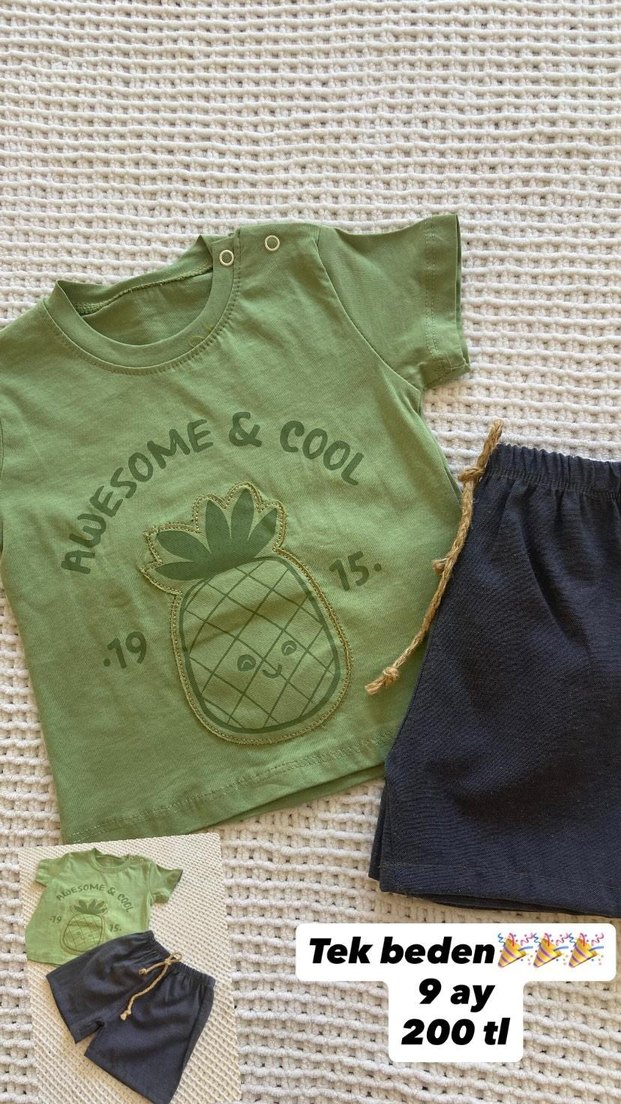 Yeşil, kısa kollu, pamuklu ve örgü dokulu tişörtü renkli ananas baskılıdır. Eşlik eden koyu renk şort ile takım oluşturur. Yuvarlak yaka ve çıtçıtlıdır.