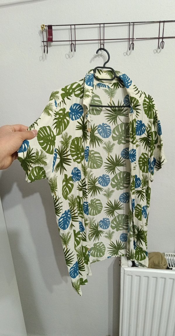 Yeşil tonlarında, kısa kollu, bol kesim ve düğmeli erkek gömleği. Tropikal yaprak baskılı ve V yaka detaylıdır.