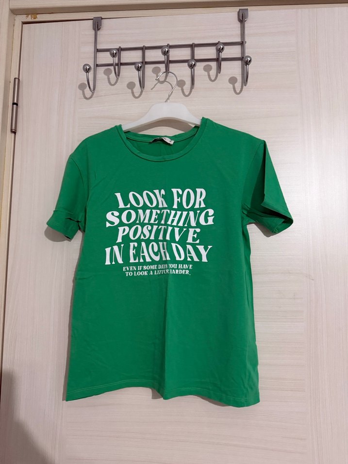 Yeşil renkli, kısa kollu ve yuvarlak yakalı salaş kesim tişört. Önünde renkli pozitif mesaj baskısı bulunur. Pürüzsüz sentetik kumaştan, günlük kullanıma uygun.