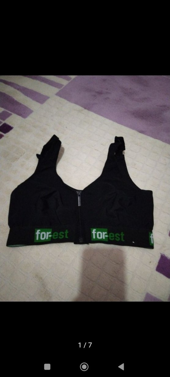 Ön fermuarlı, kısa kesim yeşil baskılı spor sütyeni. Alt bantta "for-est" yazısı yer alır, sokak stiline uygundur.