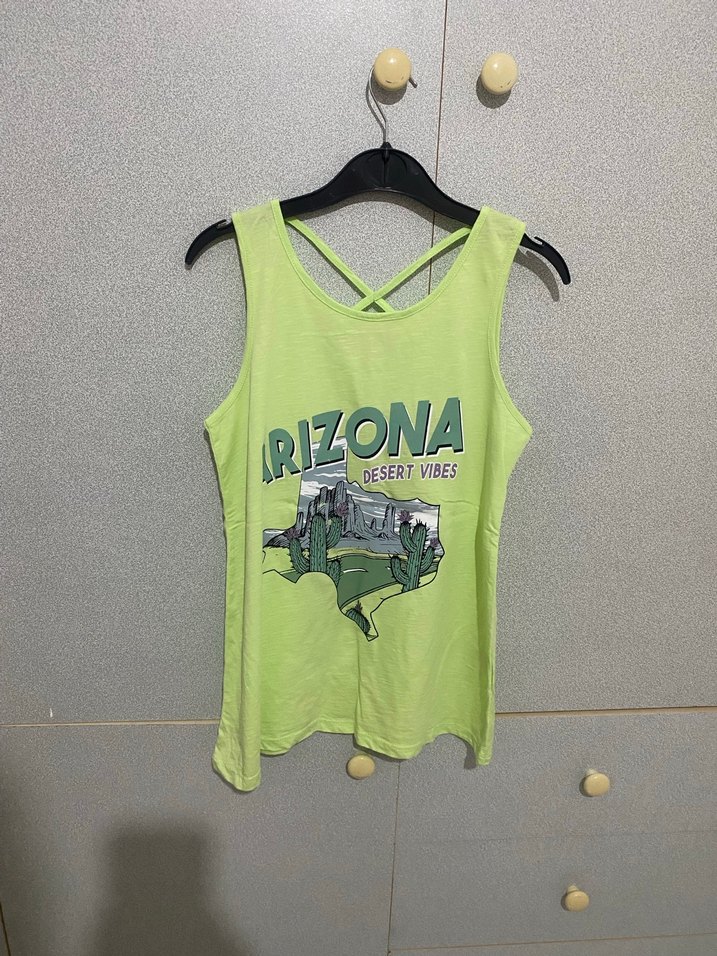 Pamuklu, rahat kesim, yuvarlak yaka, yeşil baskılı kız atleti. Önünde Arizona çöl temalı baskı bulunur.
