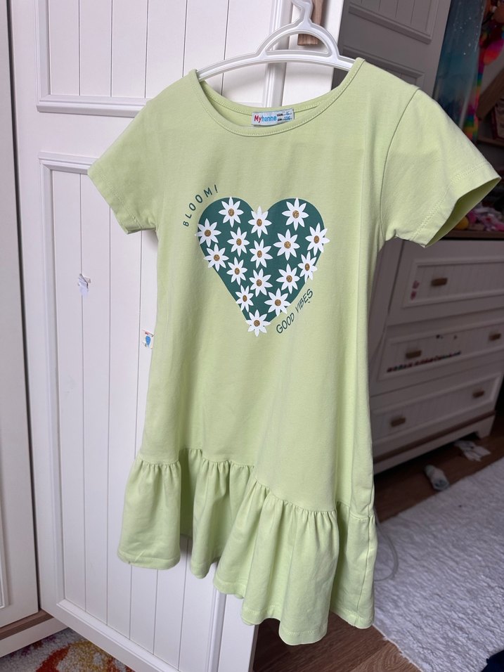 Dolabımdaki çocuk ürünlerinin hepsini toplu almak isteyen olursa 2000 liraya vereceğim. Pamuklu, kısa kollu, yuvarlak yakalı ve bol kesim pastel yeşil elbise. Çiçekli baskılı kalp ve fırfırlı etek ucu bulunur.