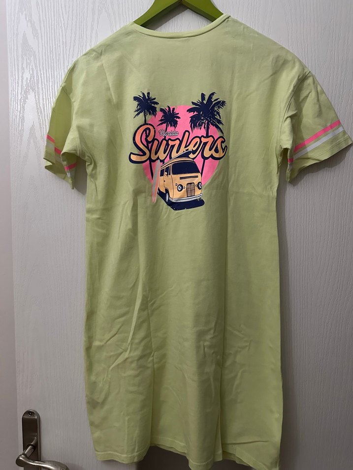 Kısa kollu, salaş kesim kız tişörtü, yuvarlak yaka ve pastel yeşil renk. Sörf temalı baskı ve düğmeli detaylar içerir.